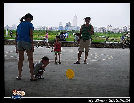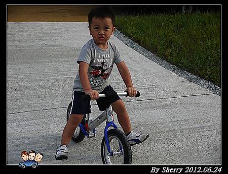 騎累了,來踢球丟飛盤,鍇不會丟,最後發明出「滾」飛盤的遊戲也能自high,小孩其實很容易快樂啊!
